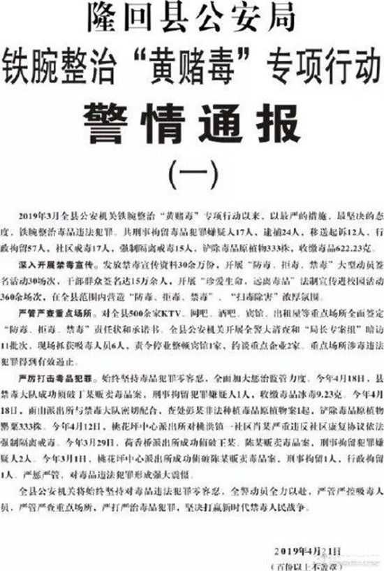 中國新報訊(記者 王道仁)昨日,湖南隆回縣公安局向社會發(fā)布鐵腕整治“黃賭毒”專項行動的警情通報,2019年3月專項行動以來,共刑事拘留毒品犯罪嫌疑人17人,逮捕24人,移送起訴12人,行政拘留57人,社區(qū)戒毒17人,強制隔離戒毒15人,鏟除毒品原植物333株,收繳毒品622.23克。