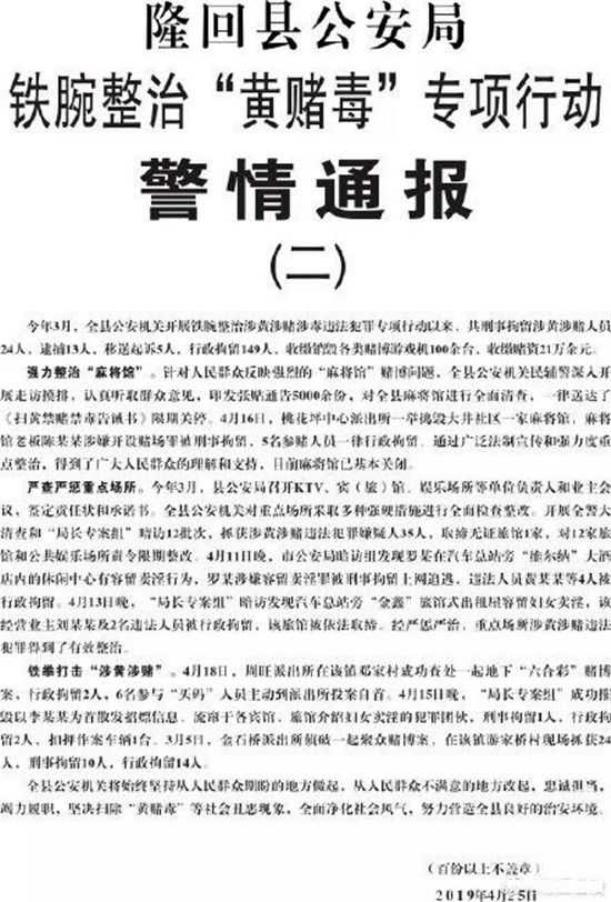 共刑事拘留涉黃涉賭人員24人,逮捕13人,移送起訴5人,行政拘留149人,收繳銷毀各類賭博游戲機100余臺,收繳賭資21萬余元。