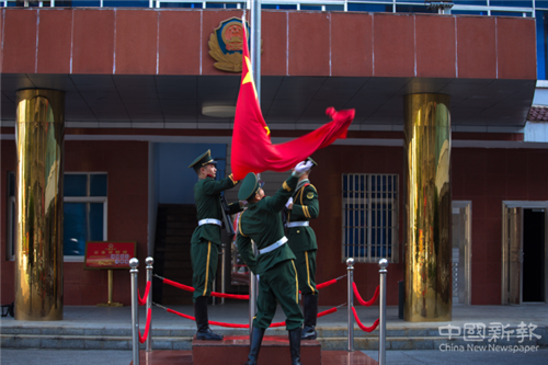 上午7時(shí),3名護(hù)旗手緊緊簇?fù)碇鴩?guó)旗,昂首闊步走向國(guó)旗桿。在雄壯的國(guó)歌聲中,鮮艷的五星國(guó)旗冉冉升起。國(guó)旗下,官兵軍容嚴(yán)整、精神振作,向五星紅旗致以崇高的敬意。整個(gè)儀式莊嚴(yán)而肅穆。升旗儀式后,全體官兵向黨旗莊嚴(yán)宣誓,用真摯的情感和鏗鏘的誓言表達(dá)了對(duì)黨的無(wú)比熱愛(ài)和無(wú)限忠誠(chéng)。
