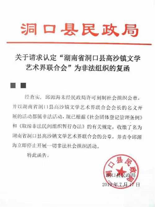 據(jù)了解,該非法社會組織是該縣高沙鎮(zhèn)邱某等人在今年4月份組建,邱某當(dāng)選為該會主席。他們未在民政部門注冊登記自4月份始擅自以“湖南省洞口縣高沙鎮(zhèn)文學(xué)藝術(shù)界聯(lián)合會”及簡稱“高沙鎮(zhèn)文聯(lián)”的名義騙取群眾的信任,頻繁開展各種非法活動;建立“高沙鎮(zhèn)文聯(lián)之聲”微信群和“高沙鎮(zhèn)文聯(lián)官方”美篇等作為對外發(fā)動和新聞宣傳平臺;未經(jīng)民政部門許可刻制公章,并在公開發(fā)行的紙質(zhì)媒體刊登從5月22日起啟用公章的聲明,在社會上產(chǎn)生了惡劣影響。洞口縣民政局主動作為,對該組織進(jìn)行調(diào)查,掌握其違法證據(jù),根據(jù)《社會團(tuán)體登記管理?xiàng)l例》和《取締非法民間組織暫行辦法》的有關(guān)規(guī)定,認(rèn)定其為非法社會組織,收繳了其公章,并責(zé)令邱某立即停止開展一切非法社會組織活動。