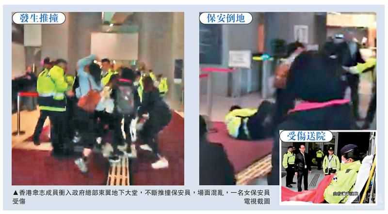 “香港眾志”主席林朗彥昨率領(lǐng)成員突襲堵塞政府總部東翼地下大堂,圖逼政府撤回修訂《逃犯條例》,眾人企圖堵塞東座大堂,與保安員發(fā)生推撞,導(dǎo)致一名女保安員受傷送院。五名衝進(jìn)大堂的女示威者更坐在地上,擾攘個(gè)多小時(shí),最后由女警抬走。九人因涉“強(qiáng)行進(jìn)入罪”被捕。政府強(qiáng)烈譴責(zé)“香港眾志”成員闖入政府總部的行為。立法會(huì)議員批評(píng)“香港眾志”行為魯莽,可能會(huì)影響政府會(huì)否再開(kāi)放東翼前地的決定。/大公報(bào)記者 龔學(xué)鳴