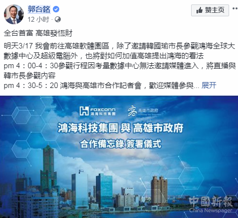 據(jù)臺灣“東森新聞網(wǎng)”3月16日報道,高雄市長韓國瑜當(dāng)天晚上在社交網(wǎng)站“臉書”直播,提到鴻海集團(tuán)將與高雄市政府簽訂合作備忘錄。韓國瑜此前就曾邀鴻海來高雄投資,而在16日直播時,韓更透露,17日要與郭臺銘直接見面,邀他來高雄擴(kuò)大投資創(chuàng)造更多工作機(jī)會。