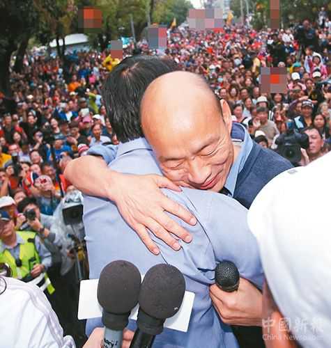 高雄市長(zhǎng)韓國(guó)瑜(右)三度到臺(tái)南幫謝龍介站臺(tái)助選,希望大家勇敢支持謝龍介,最后還送上大擁抱。(圖片來(lái)源:臺(tái)灣《聯(lián)合報(bào)》)