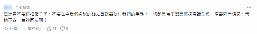 針對綠媒此番做法,有島內(nèi)網(wǎng)友反駁稱:民進(jìn)黨不要再扣帽子了。不要再拿我們繳稅的錢去買武器對付我們的手足。一切都是為了選票而搞意識型態(tài),傷害兩岸情感。天地不容,鬼神同泣啊!
