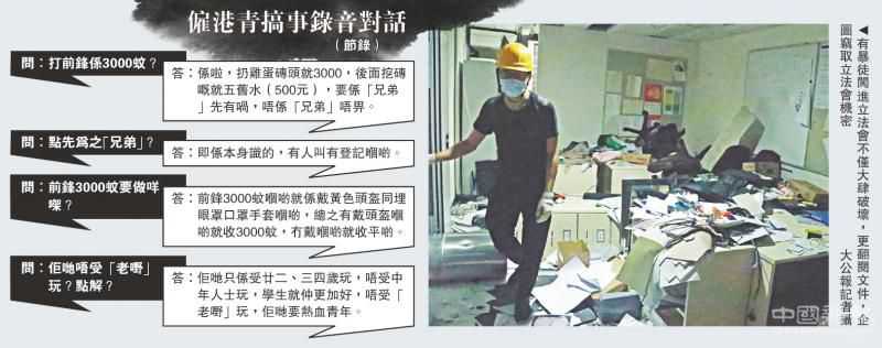 香港過去一個(gè)月被亂港派多次破壞,包括占領(lǐng)及堵塞重要干道、沖擊警方防線,又兩次圍堵警察總部,近日更趁香港回歸祖國22周年紀(jì)念日策動(dòng)暴力沖擊,占據(jù)立法會(huì)并大肆破壞。有圖有真相,大量影片、相片顯示,暴徒是有組織、有預(yù)謀作出沖擊,而非一盤散沙。有讀者向大公報(bào)報(bào)料,一段錄音對話揭發(fā)沖擊背后有人組織煽動(dòng),同時(shí)有金主提供金錢,利誘“熱血”年輕人作沖擊行為,包括挖磚、擲蛋、做前鋒等,涉及錢銀每人由500至5000元不等。此外中間人更從中“抽油水”。/大公報(bào)記者