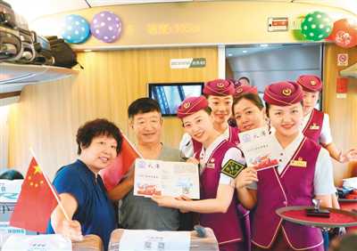 G305次復(fù)興號列車乘務(wù)員向乘客贈(zèng)送紀(jì)念品。新華社記者 邢廣利攝