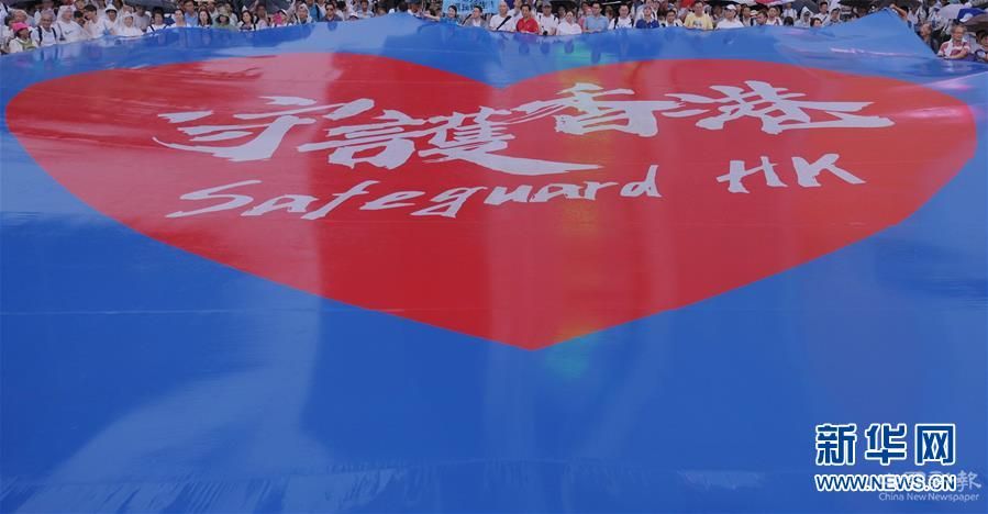 7月20日,在香港添馬公園,香港各界共同展示“守護香港”的大型標語。 新華社記者 王申 攝