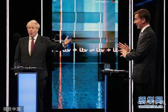 當(dāng)?shù)貢r(shí)間2019年7月9日,英國(guó)索福特,英國(guó)保守黨黨魁暨新任首相兩名競(jìng)選人鮑里斯·約翰遜與杰里米·亨特參加一場(chǎng)面對(duì)面的電視直播辯論。(圖片來源:視覺中國(guó))