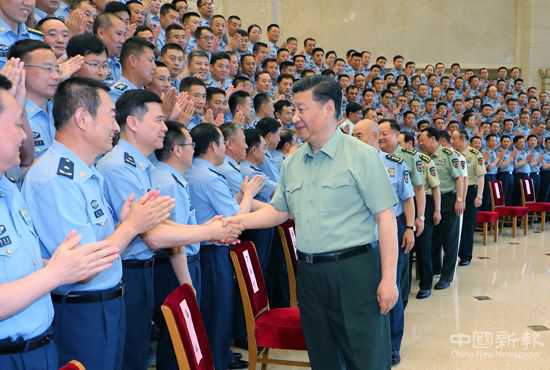 6月18日,中共中央總書記、國(guó)家主席、中央軍委主席習(xí)近平在北京接見空軍第十三次黨代表大會(huì)全體代表。這是習(xí)近平同代表們親切握手。新華社記者李剛 攝