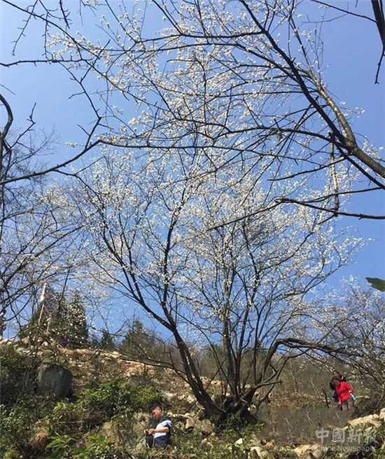 雨后的紫蓋峰,清透明朗,放眼望去,漫山遍野的山櫻花一簇簇、一叢叢,粉白的花瓣在陽(yáng)光下美不勝收。藍(lán)天下、巖石中,都是山櫻花的千姿百媚。相傳紫蓋峰的這千畝櫻花林,是民國(guó)時(shí)期的飛機(jī)播種產(chǎn)物。櫻花樹經(jīng)過(guò)幾十年的自然生長(zhǎng),碗口粗的枝干蒼勁有力。少了人工雕琢、渾然天成的原生態(tài)櫻花林,處處是風(fēng)景,山泉飛瀉而下的清響,更是格外悅耳,還吸引了不少攝影愛(ài)好者前來(lái)采風(fēng)。