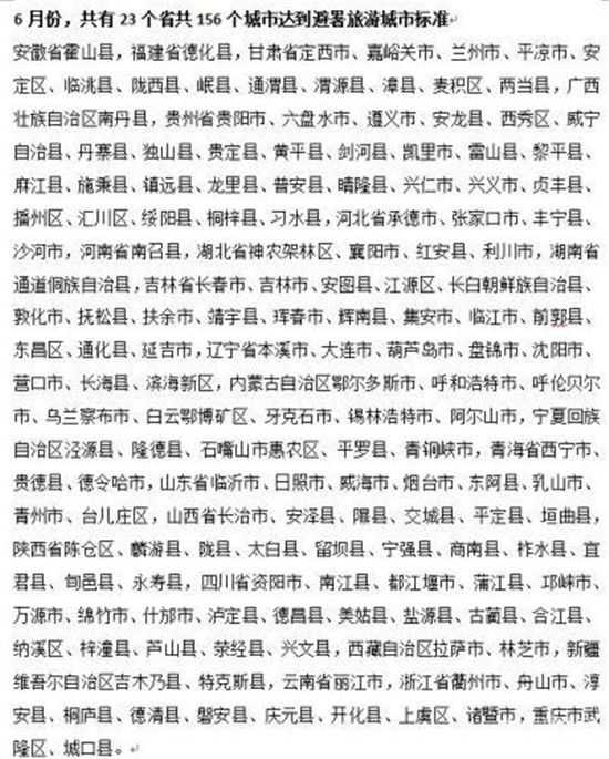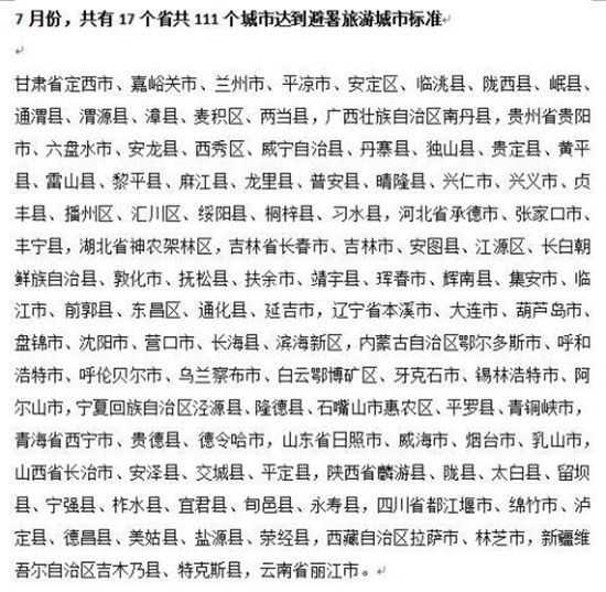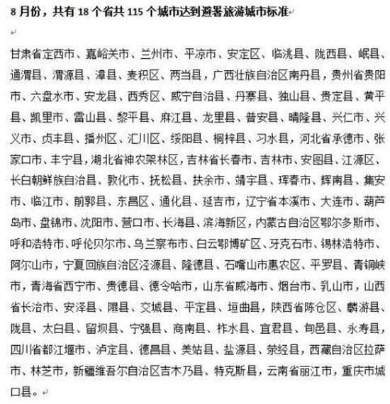 此外,專家組還根據(jù)不同月份評定6月、7月和8月分別達(dá)到避暑旅游標(biāo)準(zhǔn)的城市。