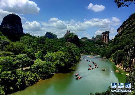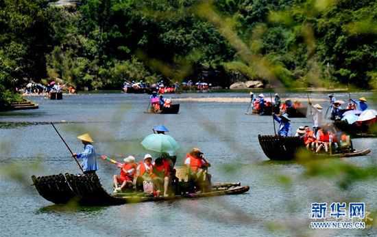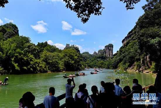 8月4日,游人乘竹筏漂流在武夷山九曲溪。 盛夏的福建武夷山,正值暑期旅游高峰,游客乘竹筏沿九曲溪漂流而下,欣賞沿岸美麗風(fēng)光。 新華社記者 張國(guó)俊 攝
