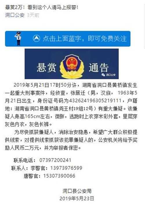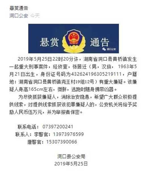 而在5月23日,洞口縣公安局官方微信公眾號(hào)曾發(fā)布消息稱,2019年5月21日17時(shí)50分許,湖南省洞口縣黃橋鎮(zhèn)發(fā)生一起重大刑事案件,經(jīng)偵查,張居遷(男,漢族, 1963年5月21日出生,身份證號(hào)碼為432624196305219111,戶籍地:湖南省洞口縣黃橋鎮(zhèn)堯王村19組12號(hào))有重大嫌疑。該嫌疑人身高165cm左右,微胖,逃跑時(shí)上衣穿米彩外套,里層穿灰色內(nèi)衣,灰色長(zhǎng)褲。