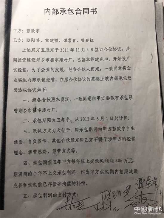 福宇建材廠的股東代表譚常青告訴記者,當初合伙建廠,出于信任,經(jīng)幾名股東商量,由彭政宇一人任法人,并辦理了相關(guān)手續(xù),將磚廠建好之后,五合伙人商定由彭政宇以內(nèi)部承包的模式經(jīng)營該廠。承包自2012年6月1日起計算,承包期限5年半。在《內(nèi)部承包合同書》上協(xié)議,承包期前五年彭政宇每年上交承包利潤306萬元。該協(xié)議還約定:承包期內(nèi),彭政宇不得將本企業(yè)轉(zhuǎn)由他人承包,也不得與他人合伙承包經(jīng)營。9月5日,雙方就承包利潤的支付方式等具體事項簽訂了補充協(xié)議。