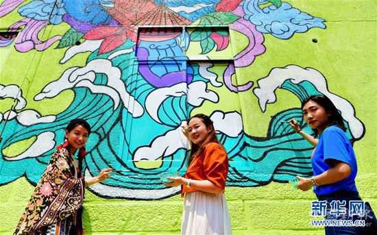 6月15日,福州大學廈門工藝美術學院的鄭曼璐(中)和劉淼(右)與臺灣清華大學美術學院研究生張雅嵐(左)共同創(chuàng)作涂鴉作品《源園》。當日,2019海峽論壇第二屆創(chuàng)意涂鴉巡回賽在廈門市集美區(qū)大社文創(chuàng)旅游街區(qū)舉辦啟動儀式。本屆巡回賽以“共繪家園”為主題,5支隊伍20名兩岸選手用手中的筆畫,勾勒出對共同家園的美好愿景。新華社記者 魏培全 攝