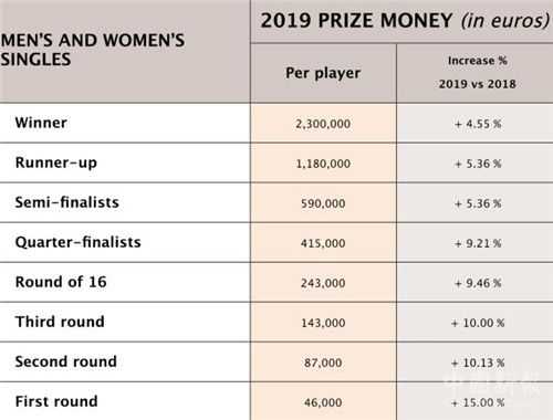 根據(jù)法網(wǎng)組委會(huì)公布的獎(jiǎng)金分配方案,男、女單打冠軍將各獲得230萬(wàn)歐元,較上一年增長(zhǎng)了10萬(wàn)歐元。