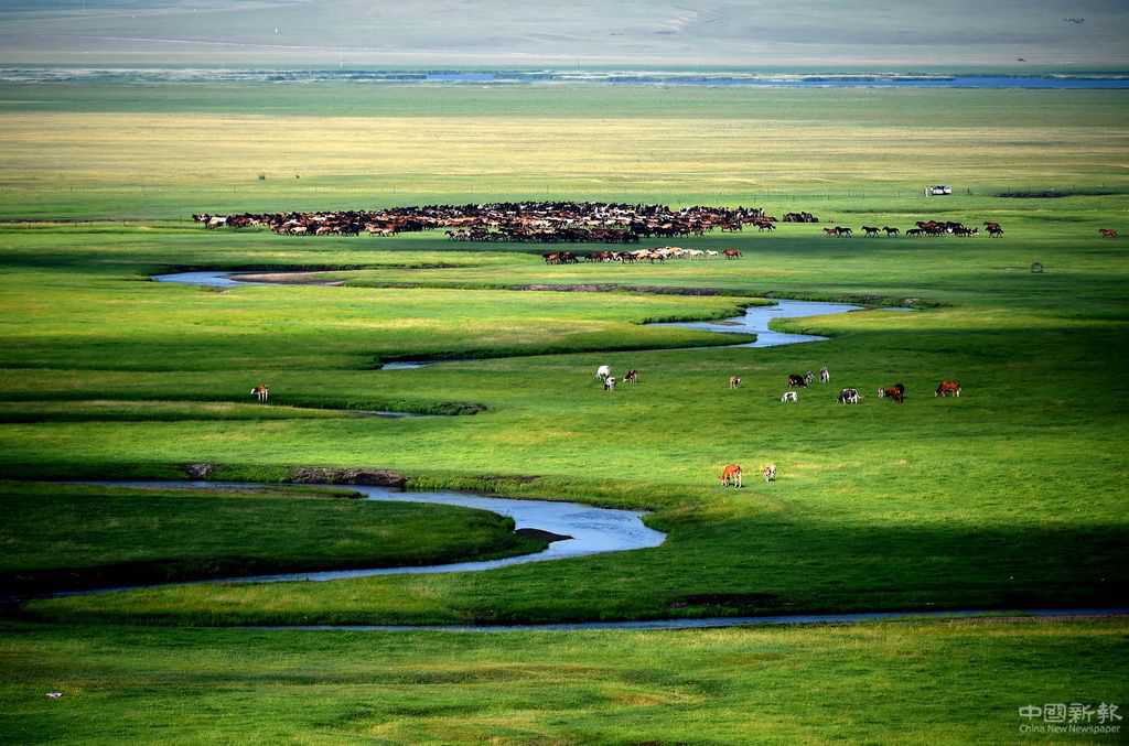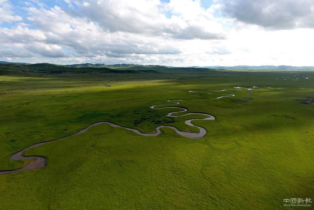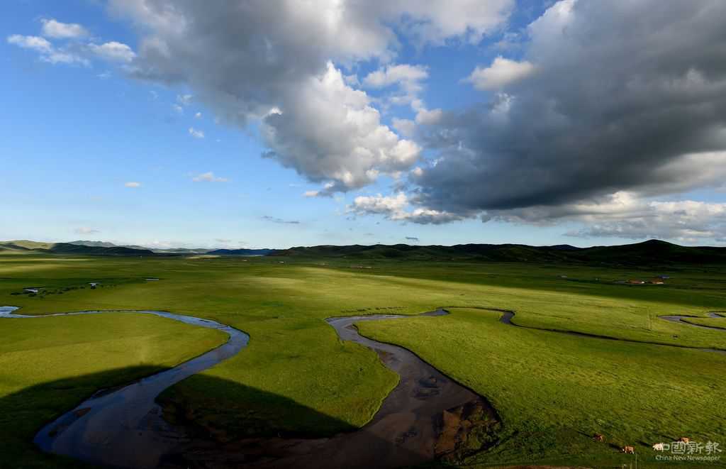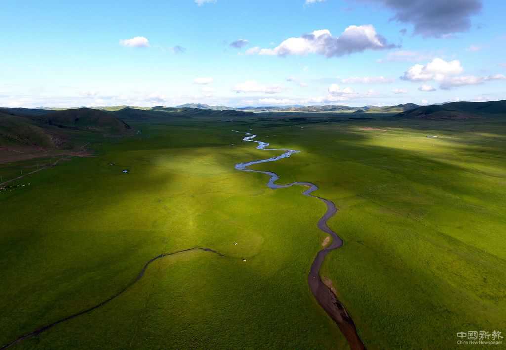 今年,豐富的降雨讓位于內(nèi)蒙古中部的錫林郭勒大草原在盛夏時節(jié)水草豐美,成為一片綠色的海洋。彎曲的河流、天空中飄動的云朵與草地間的牛羊和馬群構(gòu)成一幅夏日美麗畫卷。 新華社記者 任軍川 攝