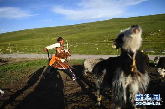10歲的扎西東智在家中的牛圈內(nèi)追逐一只小牦牛,準(zhǔn)備帶它去牛媽媽跟前吃奶(7月31日攝)。