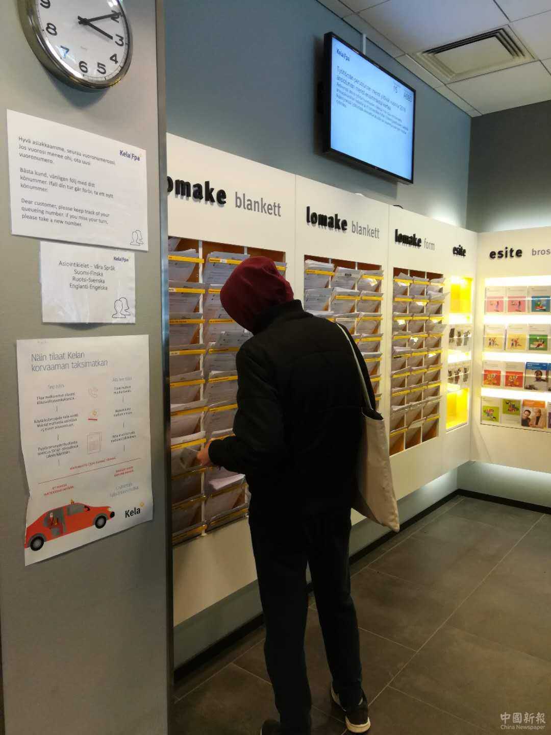 芬蘭國民社保局內(nèi),一名申請補貼者正從種類繁多的申請表中找自己需要的材料。張蕾 攝