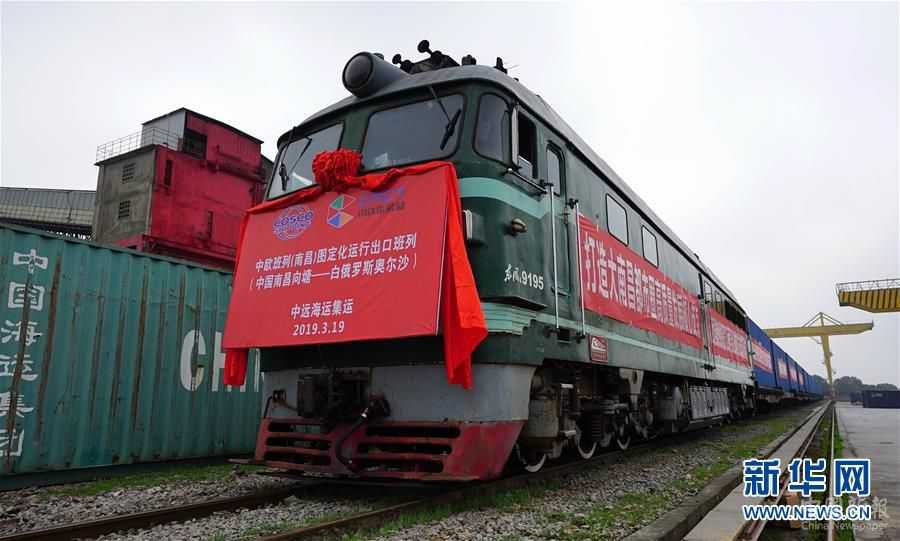 這是在南昌(向塘)鐵路口岸拍攝的從南昌發(fā)往白俄羅斯的中歐班列(2019年3月19日攝)。新華社記者彭昭之?dāng)z