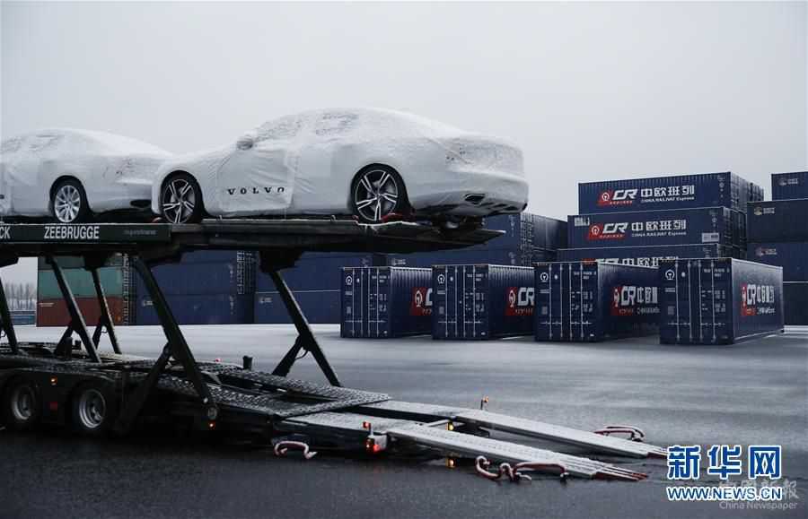 這是2017年11月30日,在比利時(shí)根特港貨運(yùn)場站中歐班列沃爾沃汽車專列的專用停車場,沃爾沃S90汽車被裝車運(yùn)往其它歐盟國家。新華社記者葉平凡攝