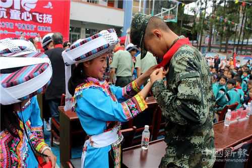 學(xué)生為官兵佩戴紅領(lǐng)巾。