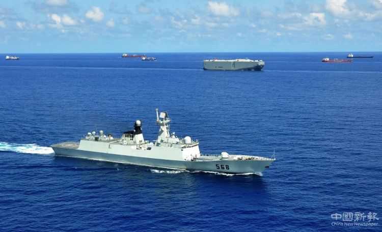 2010年5月8日,中國(guó)海軍第5批護(hù)航編隊(duì)巢湖艦為商船護(hù)航(資料照片)。新華社發(fā)(曹海華攝)