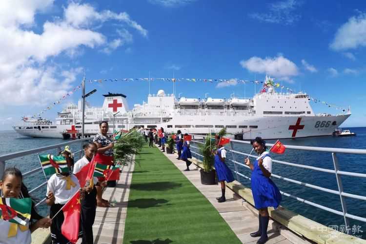 2018年10月12日,在多米尼克首都羅索,當(dāng)?shù)貙W(xué)生揮動(dòng)多中兩國(guó)國(guó)旗歡迎中國(guó)海軍和平方舟醫(yī)院船首次到訪。