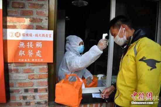 資料圖:餐廳員工對取餐外賣小哥進行測溫登記,并用酒精進行手部消毒。中新社記者 劉冉陽 攝