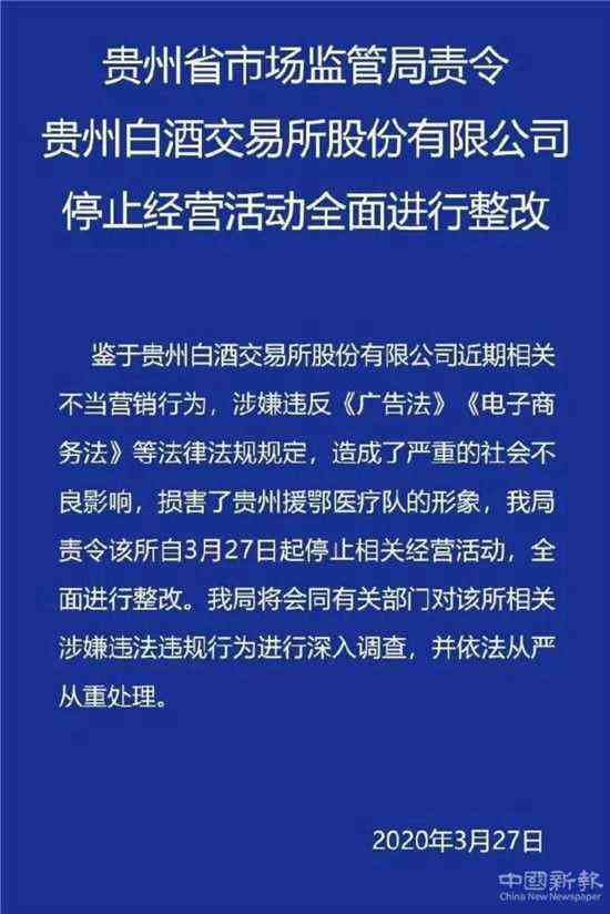 鑒于貴州白酒交易所股份有限公司近期相關不當營銷行為,涉嫌違反《廣告法》《電子商務法》等法律法規(guī)規(guī)定,造成了嚴重的社會不良影響,損害了貴州援鄂醫(yī)療隊的形象,我局責令該所自3月27日起停止相關經(jīng)營活動,全面進行整改。我局將會同有關部門對該所相關涉嫌違法違規(guī)行為進行深入調(diào)查,并依法從嚴從重處理。