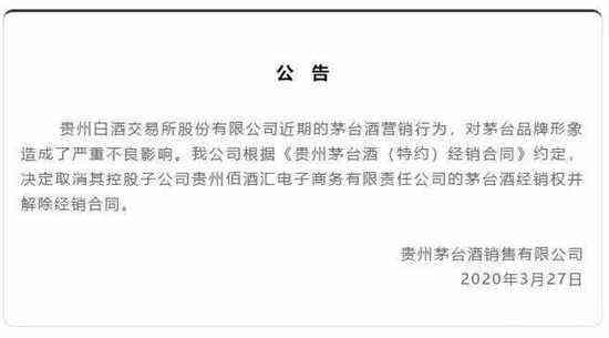 中國新報(記者 劉鵬飛)3月27日,據(jù)貴州茅臺公告,貴州白酒交易所股份有限公司近期的茅臺酒營銷行為,對茅臺品牌形象造成了嚴重不良影響。根據(jù)《貴州茅臺酒(特約)經(jīng)銷合同》約定,決定取消其控股子公司貴州佰酒匯電子商務有限責任公司的茅臺酒經(jīng)銷權并解除經(jīng)銷合同。