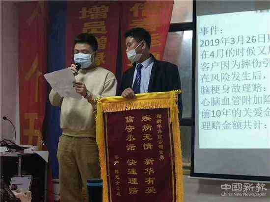 中國新報(記者 李社慶 通訊員 黃勇)日前,新華保險邵東支公司早會上,來了一對特殊的夫妻,他們不是公司職員,而是“新華保險”的客戶。會上,夫妻倆將印有"疾病無情,新華有愛。信守承諾,快速理賠"的錦旗送到保單所屬保險公司服務(wù)人員黃勇經(jīng)理的手中,并在現(xiàn)場發(fā)表了自已的感言。短短五分鐘的理賠感言,令人感動,催人淚下,近兩百與會者,一時滿堂動容,紛紛拍照轉(zhuǎn)發(fā)朋友圈。