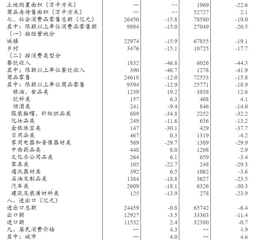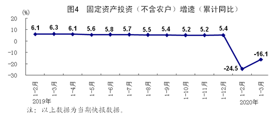 一季度,全國(guó)固定資產(chǎn)投資(不含農(nóng)戶)84145億元,同比下降16.1%,降幅比1-2月份收窄8.4個(gè)百分點(diǎn)。分領(lǐng)域看,基礎(chǔ)設(shè)施投資下降19.7%,制造業(yè)投資下降25.2%,房地產(chǎn)開發(fā)投資下降7.7%,降幅分別比1-2月份收窄10.6、6.3和8.6個(gè)百分點(diǎn)。全國(guó)商品房銷售面積21978萬平方米,下降26.3%;商品房銷售額20365億元,下降24.7%,降幅分別比1-2月份收窄13.6和11.2個(gè)百分點(diǎn)。分產(chǎn)業(yè)看,第一產(chǎn)業(yè)投資下降13.8%,第二產(chǎn)業(yè)投資下降21.9%,第三產(chǎn)業(yè)投資下降13.5%;民間投資47804億元,下降18.8%,降幅分別比1-2月份收窄11.8、6.3、9.5和7.6個(gè)百分點(diǎn)。高技術(shù)產(chǎn)業(yè)投資下降12.1%,降幅小于全部投資4.0個(gè)百分點(diǎn),其中高技術(shù)制造業(yè)和高技術(shù)服務(wù)業(yè)投資分別下降13.5%和9.0%。高技術(shù)制造業(yè)中,計(jì)算機(jī)及辦公設(shè)備制造投資增長(zhǎng)3.2%。高技術(shù)服務(wù)業(yè)中,電子商務(wù)服務(wù)投資增長(zhǎng)39.6%,專業(yè)技術(shù)服務(wù)投資增長(zhǎng)36.7%,科技成果轉(zhuǎn)化服務(wù)投資增長(zhǎng)17.4%。社會(huì)領(lǐng)域投資下降8.8%,其中衛(wèi)生領(lǐng)域投資下降0.9%,降幅低于全部投資15.2個(gè)百分點(diǎn),生物藥品制品制造業(yè)等與抗疫相關(guān)行業(yè)投資保持增長(zhǎng),重點(diǎn)防疫工程建設(shè)快速推進(jìn)。從環(huán)比看,3月份固定資產(chǎn)投資(不含農(nóng)戶)比上月增長(zhǎng)6.05%。