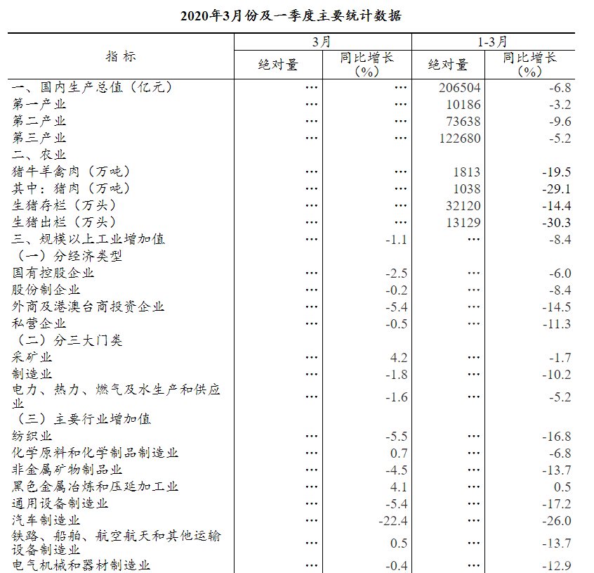 初步核算,一季度國(guó)內(nèi)生產(chǎn)總值206504億元,按可比價(jià)格計(jì)算,同比下降6.8%。分產(chǎn)業(yè)看,第一產(chǎn)業(yè)增加值10186億元,下降3.2%;第二產(chǎn)業(yè)增加值73638億元,下降9.6%;第三產(chǎn)業(yè)增加值122680億元,下降5.2%。