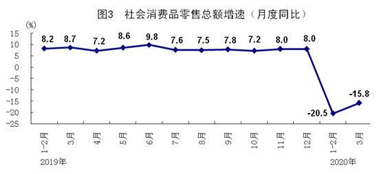 一季度,社會(huì)消費(fèi)品零售總額78580億元,同比下降19.0%。其中,3月份社會(huì)消費(fèi)品零售總額26450億元,下降15.8%,降幅比1-2月份收窄4.7個(gè)百分點(diǎn);商品零售下降12.0%,降幅比1-2月份收窄5.6個(gè)百分點(diǎn)。按經(jīng)營(yíng)單位所在地分,一季度城鎮(zhèn)消費(fèi)品零售額67855億元,下降19.1%;鄉(xiāng)村消費(fèi)品零售額10725億元,下降17.7%。按消費(fèi)類型分,餐飲收入6026億元,下降44.3%;商品零售72553億元,下降15.8%。與居民生活密切相關(guān)商品呈現(xiàn)增長(zhǎng)態(tài)勢(shì),限額以上單位糧油、食品類,飲料類和中西藥品類商品分別增長(zhǎng)12.6%、4.1%和2.9%,比1-2月份分別加快2.9、1.0和2.7個(gè)百分點(diǎn)。全國(guó)網(wǎng)上零售額22169億元,同比下降0.8%。其中,實(shí)物商品網(wǎng)上零售額18536億元,增長(zhǎng)5.9%,比1-2月份加快2.9個(gè)百分點(diǎn);占社會(huì)消費(fèi)品零售總額的比重為23.6%,比1-2月份提高2.1個(gè)百分點(diǎn)。