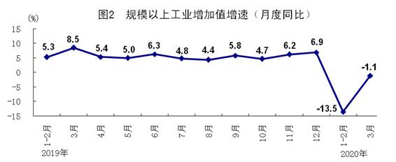 一季度,全國(guó)規(guī)模以上工業(yè)增加值同比下降8.4%。其中,3月份規(guī)模以上工業(yè)增加值同比下降1.1%,降幅較 1-2月份收窄12.4個(gè)百分點(diǎn);環(huán)比增長(zhǎng)32.13%,工業(yè)產(chǎn)出規(guī)模接近去年同期水平。分經(jīng)濟(jì)類型看,一季度國(guó)有控股企業(yè)增加值同比下降6.0%;股份制企業(yè)下降8.4%,外商及港澳臺(tái)商投資企業(yè)下降14.5%;私營(yíng)企業(yè)下降11.3%。分三大門類看,采礦業(yè)增加值下降1.7%,制造業(yè)下降10.2%,電力、熱力、燃?xì)饧八a(chǎn)和供應(yīng)業(yè)下降5.2%?;A(chǔ)原材料和新產(chǎn)品生產(chǎn)保持增長(zhǎng),天然氣、無紡布、化學(xué)藥品原藥、原油、十種有色金屬、乙烯和粗鋼產(chǎn)量分別增長(zhǎng)9.1%、6.1%、4.5%、2.4%、2.1%、1.3% 和1.2%;自動(dòng)售貨機(jī)、售票機(jī),電子元件,集成電路,城市軌道車輛,太陽能電池產(chǎn)量分別增長(zhǎng)35.3%、16.2%、16.0%、13.1%和3.4%。3月份,高技術(shù)制造業(yè)同比增長(zhǎng)8.9%,其中計(jì)算機(jī)、通信和其他電子設(shè)備制造業(yè)增長(zhǎng)9.9%。工業(yè)機(jī)器人和發(fā)電機(jī)組產(chǎn)量分別增長(zhǎng)12.9%和20.0%。
