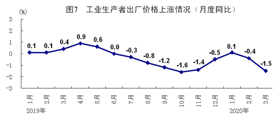 一季度,全國(guó)工業(yè)生產(chǎn)者出廠價(jià)格同比下降0.6%。其中3月份同比下降1.5%,環(huán)比下降1.0%,同比降幅比1-2月份擴(kuò)大1.1個(gè)百分點(diǎn)。一季度,全國(guó)工業(yè)生產(chǎn)者購(gòu)進(jìn)價(jià)格同比下降0.8%。其中3月份同比下降1.6%,環(huán)比下降1.1%。