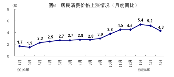 一季度,全國(guó)居民消費(fèi)價(jià)格同比上漲4.9%。其中,3月份全國(guó)居民消費(fèi)價(jià)格同比上漲4.3%,漲幅比2月份回落0.9個(gè)百分點(diǎn);環(huán)比下降1.2%。一季度,城市上漲4.6%,農(nóng)村上漲5.9%。分類別看,食品煙酒價(jià)格同比上漲14.9%,衣著上漲0.2%,居住上漲0.2%,生活用品及服務(wù)上漲0.2%,交通和通信下降1.5%,教育文化和娛樂上漲1.9%,醫(yī)療保健上漲2.2%,其他用品和服務(wù)上漲4.9%。在食品煙酒價(jià)格中,糧食價(jià)格上漲0.6%;鮮菜價(jià)格上漲9.0%,由2月份的上漲10.9%轉(zhuǎn)為3月份下降0.1%;豬肉價(jià)格上漲122.5%,其中3月份上漲116.4%,比2月份回落18.8個(gè)百分點(diǎn)??鄢称泛湍茉磧r(jià)格后的核心CPI上漲1.3%。