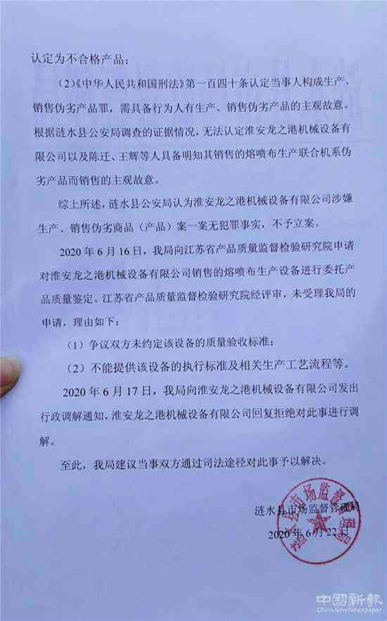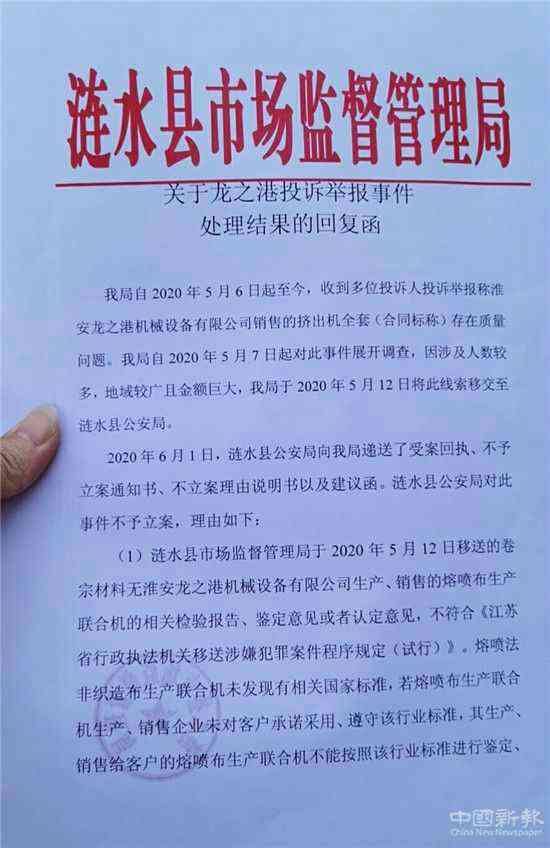 漣水縣公安局回執(zhí),無(wú)淮安龍之港公司生產(chǎn)、銷售的熔噴布生產(chǎn)聯(lián)合機(jī)的相關(guān)檢測(cè)報(bào)告、鑒定意見或者認(rèn)定意見,不符合《江蘇省行政執(zhí)法機(jī)關(guān)移送涉嫌犯罪案件程序規(guī)定(試行)》,不予立案。