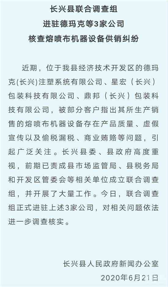 此類事件并非個(gè)例,源引自澎湃新聞6月21報(bào)道:“多家企業(yè)出售的熔噴布設(shè)備產(chǎn)不出合格熔噴布”一事。浙江湖州長(zhǎng)興縣委外宣辦官方公眾號(hào)“長(zhǎng)興發(fā)布”發(fā)布署名長(zhǎng)興縣政府新聞辦的通報(bào)稱,長(zhǎng)興縣聯(lián)合調(diào)查組進(jìn)駐德瑪克等3家公司核查熔噴布機(jī)器設(shè)備供銷糾紛。