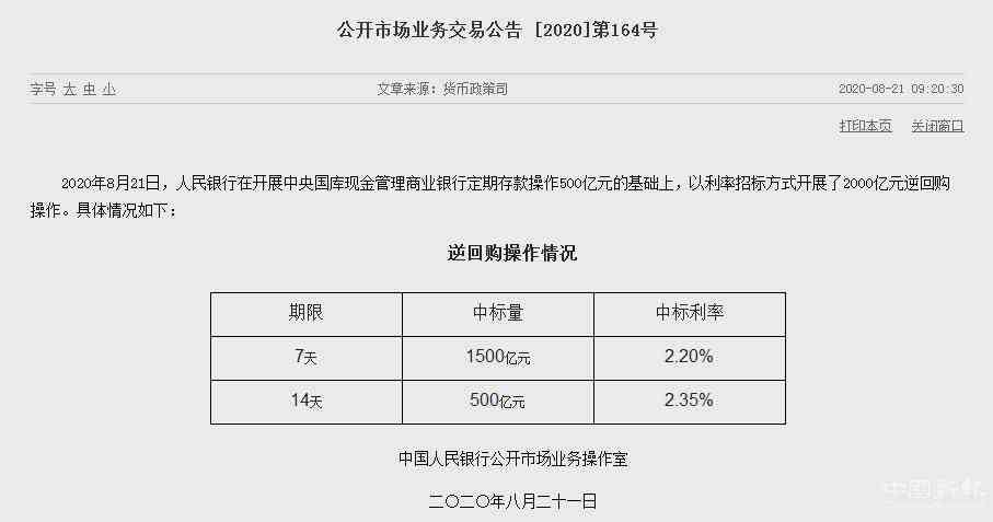 據(jù)央行網(wǎng)站21日消息,央行公告稱,8月21日在開展中央國庫現(xiàn)金管理商業(yè)銀行定期存款操作500億元的基礎(chǔ)上,以利率招標(biāo)方式開展了2000億元逆回購操作。包括1500億元7天期和500億元14天期,中標(biāo)利率分別為2.20%和2.35%,均與上次持平。