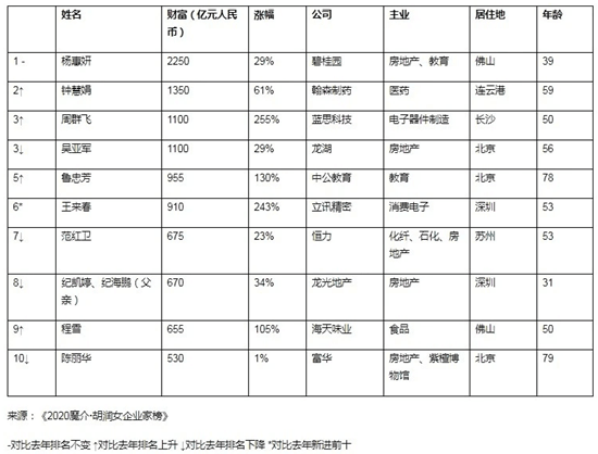 27日,胡潤(rùn)研究院發(fā)布《2020魔介·胡潤(rùn)女企業(yè)家榜》。碧桂園39歲的楊惠妍財(cái)富增長(zhǎng)500億,以2250億連續(xù)四年蟬聯(lián)中國(guó)女首富。“醫(yī)藥女王”59歲的鐘慧娟、藍(lán)思科技50歲的周群飛分列二、三位,財(cái)富分別為1350億和1100億。