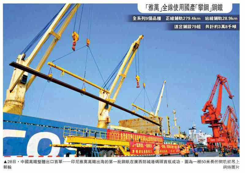 中國與印尼合作建設(shè)的雅萬高鐵全長142.3公里,是東南亞第一條最高設(shè)計時速350公里的高鐵。據(jù)悉,此次出口的鋼軌自今年3月份起,按100米長軌從攀鋼集團(tuán)有限公司(以下簡稱“攀鋼”)陸續(xù)運(yùn)抵防城港后,根據(jù)印尼對供貨的要求,鋸切為50米鋼軌出口。