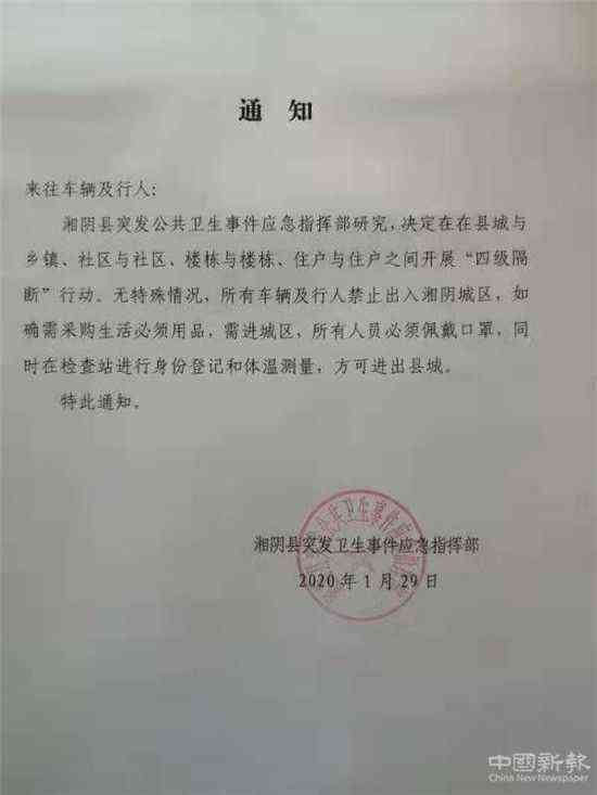湘陰縣突發(fā)公共衛(wèi)生事件應(yīng)急指揮部研究:決定在縣城與鄉(xiāng)鎮(zhèn)、社區(qū)與社區(qū)、樓棟與樓棟、住戶與住戶之間開展“四級隔斷行動”。無特殊情況,所有車輛及行人禁止出入湘陰城區(qū),如確需采購生活必須用品,需進城區(qū),所有人員必須佩戴口罩,同時在檢查站進行身份登記和體溫測量,方可進出縣城。