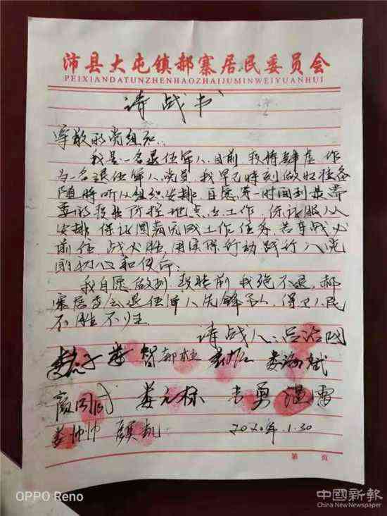 “尊敬的黨組織:我是一名退伍軍人。目前,疫情肆虐,作為一名退伍軍人、黨員,我早已做好準(zhǔn)備,隨時聽從組織的安排,自愿第一時間到最需要的疫疾防控地點工作,服從組織安排,保證圓滿完成工作任務(wù)。若有戰(zhàn),必前往,戰(zhàn)必勝,用實際行動踐行自己入黨的初心和使命。