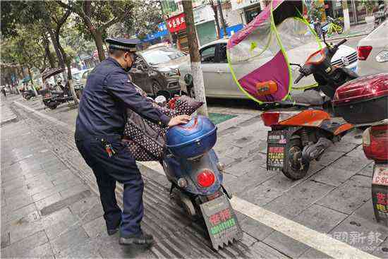 執(zhí)法人員幫助車主將二輪車規(guī)范停放
