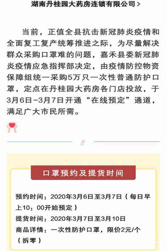“當前,正值全縣抗擊新冠肺炎疫情和全面復工復產(chǎn)統(tǒng)籌推進之際,為盡量解決群眾采購口罩難的問題,嘉禾縣委新冠肺炎疫情應急指揮部決定,由疫情防控物資保障組統(tǒng)一采購一次性普通防護口罩,定點在丹桂園大藥房各門店投放,于3月6日-3月7日開通“在線預定”通道,滿足廣大市民所需。”3月7日,嘉禾縣丹桂園大藥房通過公眾號發(fā)出通知,通知指出,口罩限價2元/個,每個身份證3天內(nèi)只能預定一次,每次限預定3個,顧客自愿購買。