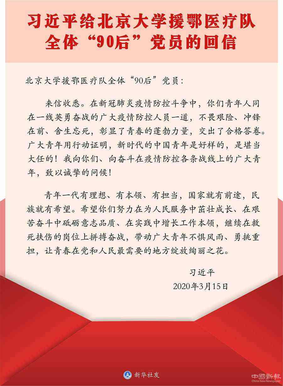 近日,北京大學(xué)援鄂醫(yī)療隊的34名“90后”黨員給習(xí)近平總書記寫信,匯報了在抗疫一線搶救生命的情況,表達了繼續(xù)發(fā)揮黨員作用、為打贏疫情防控阻擊戰(zhàn)貢獻力量的決心。