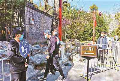 昨天,北青報(bào)記者來到景山公園,門區(qū)的現(xiàn)場(chǎng)售票窗口已全部取消。同時(shí),景山山體實(shí)行單向限流管控措施,僅保留一處上山入口和一處下山入口,其余路口暫時(shí)封閉。公園職工手拿“請(qǐng)您排隊(duì)等候”的牌示,引導(dǎo)游客順序游覽。