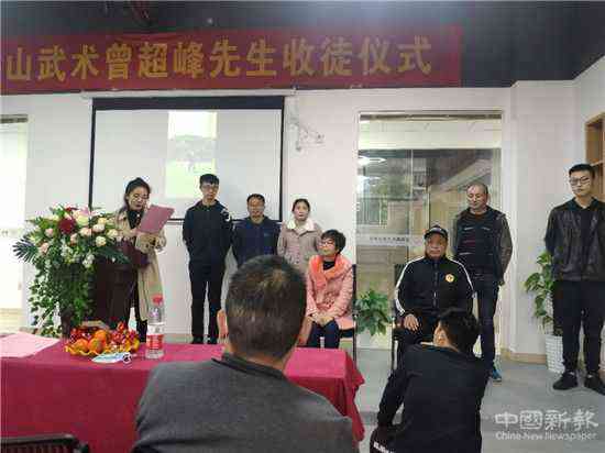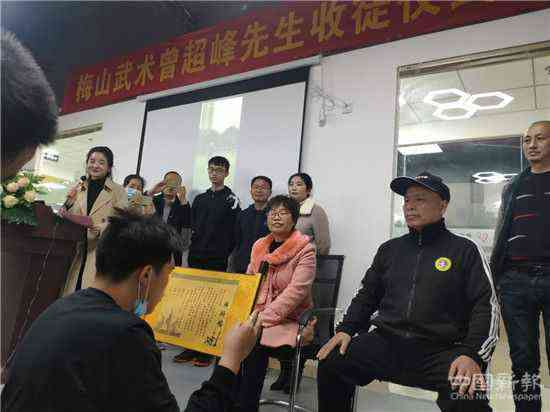 曾超峰正襟危坐,目不斜視。小彭穿著練“武”服裝,他首先單膝下跪在曾教練夫妻面前,然后雙手將拜師貼恭敬地舉過頭頂,然后他拿著類似古代圣旨的拜師貼讀了起來。